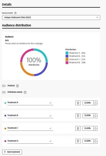 My question is about the percentage update. It's not working properly or not being distributed correctly when the journey is triggered. All profiles are only receiving 1 or 2 treatment emails, even though I created 4 treatments and tested with 4 profiles. audience distribution also added 25% each.