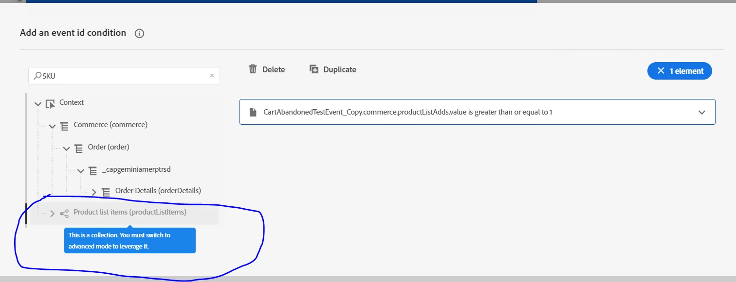 Hi, We are trying to pull the collection value in an event condition on the sandbox environment, but it is showing as disabled, while hovering over that collection, its giving a popup to switch to advance mode. But advance mode is not showing in that condition, Can anybody suggest why?
