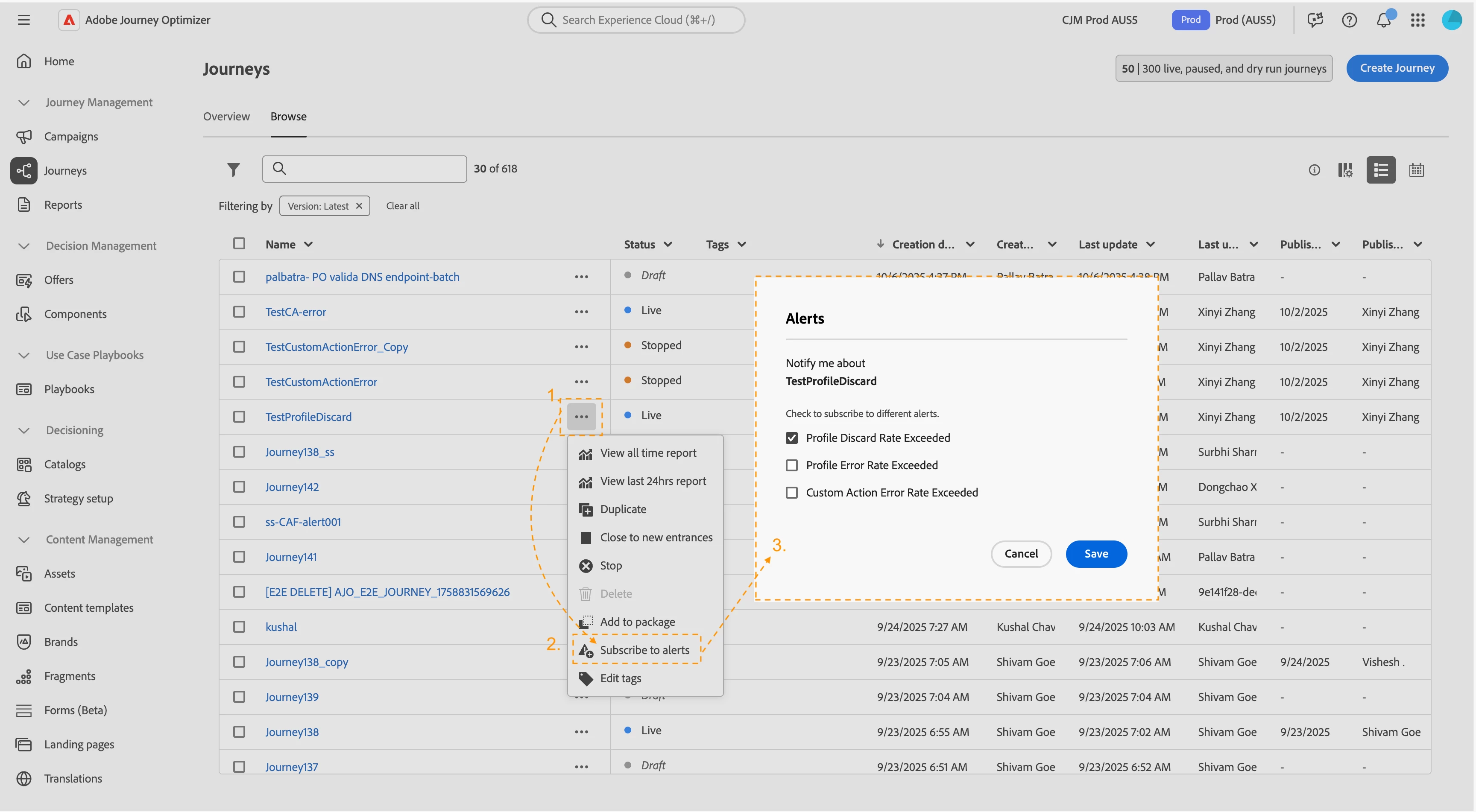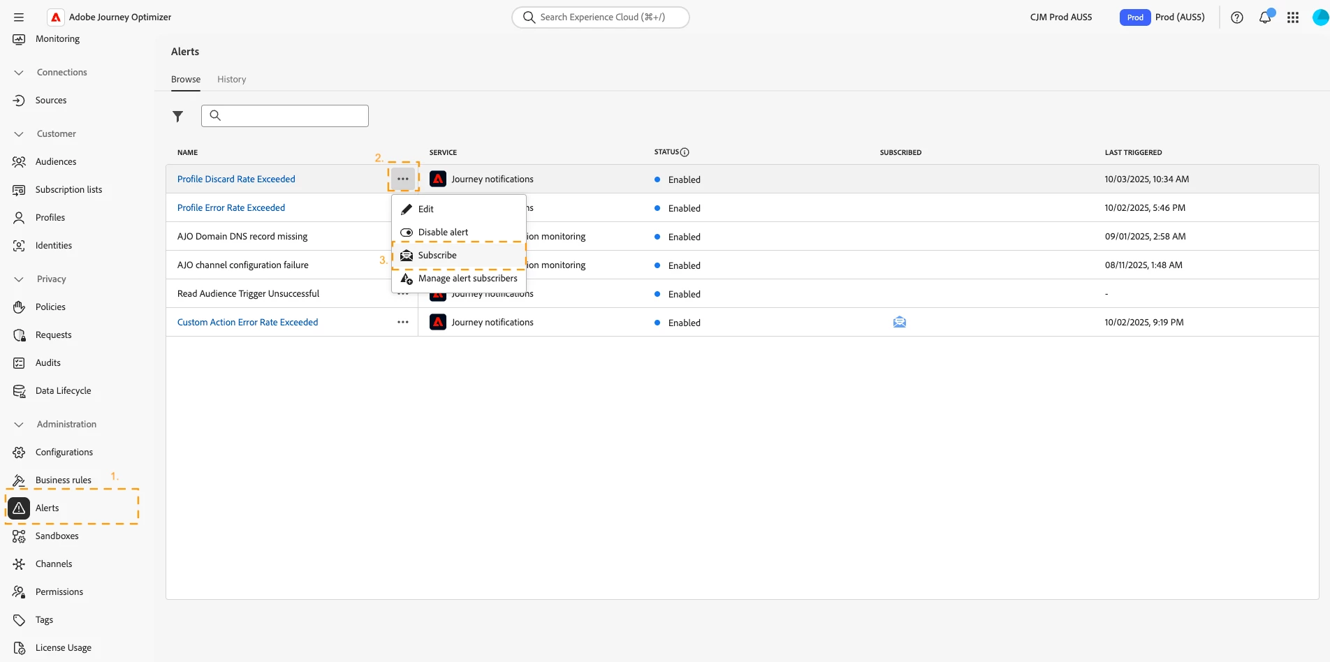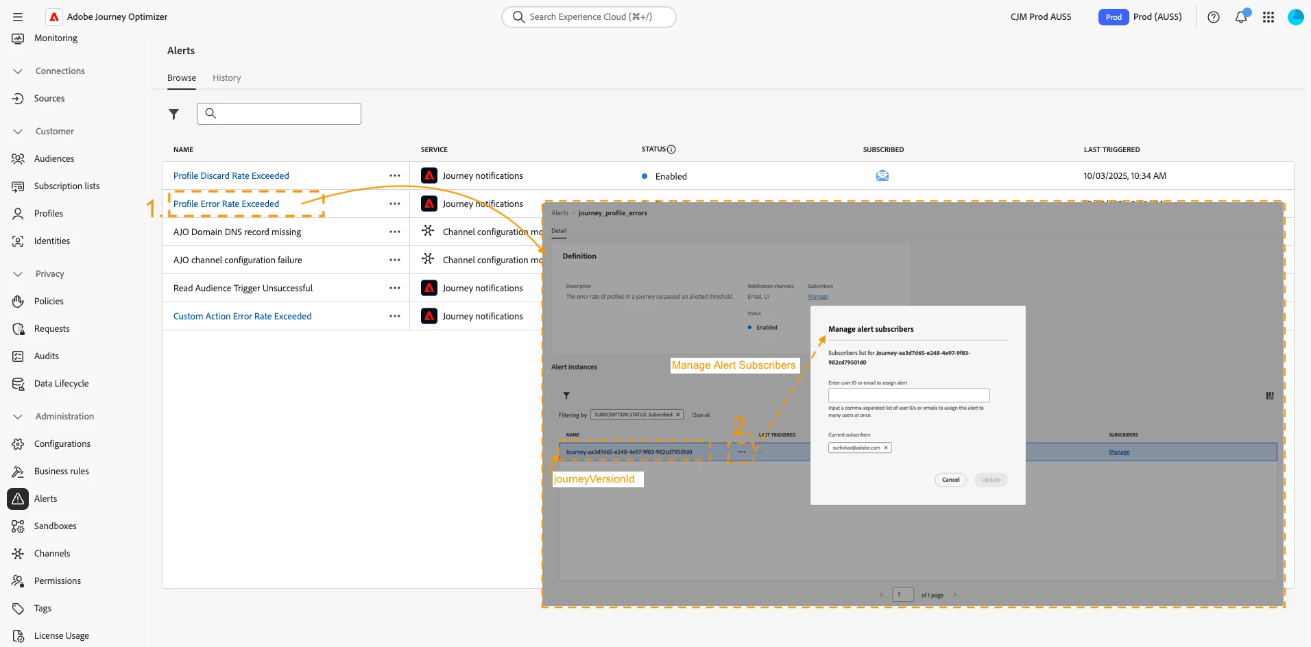 Subscribe once to receive alerts for all journeys within a sandbox—ideal for team-wide operational awareness. Manage these from the AEP Alerts page. -