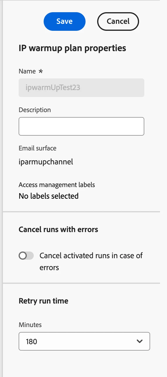 - Configurable Retry Duration: You can define a specific time window during which the IP warm-up campaign can be executed, even if there are delays in audience evaluation. This is set by clicking the Properties icon next to the plan name and using the Retry run time drop-down list.