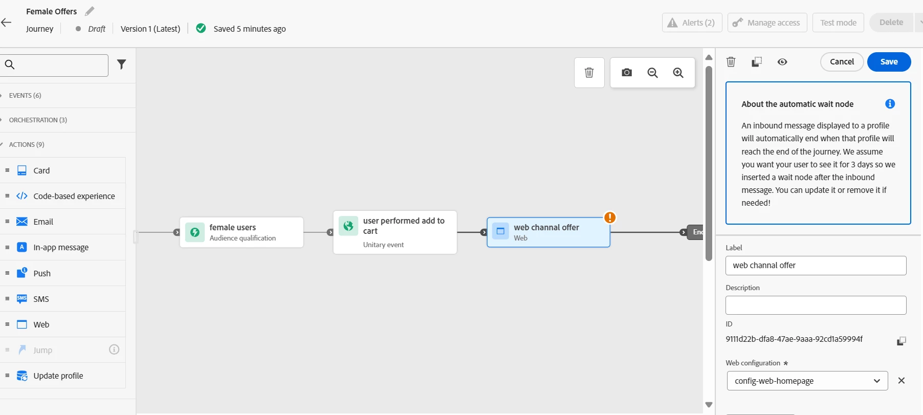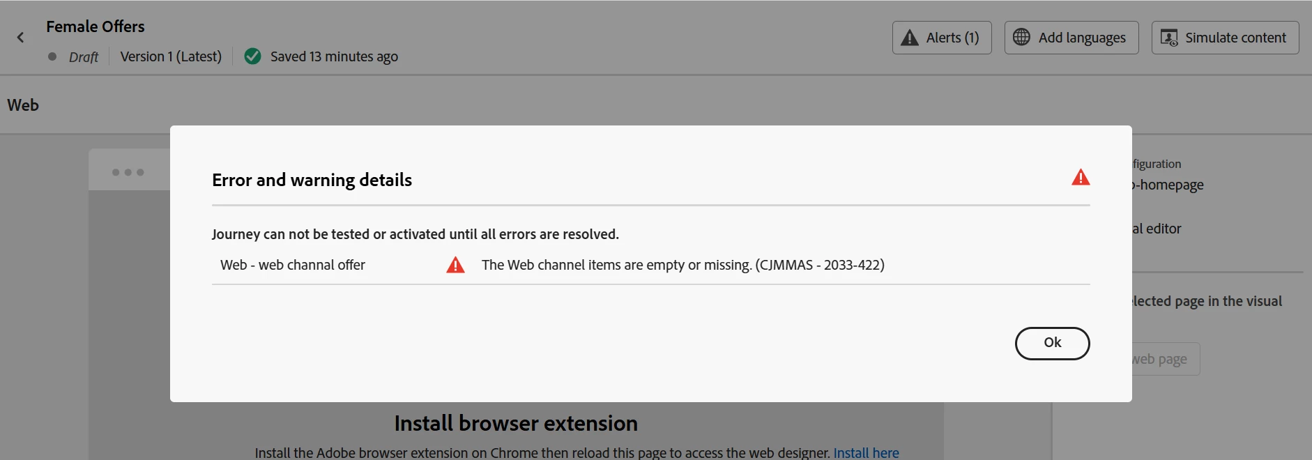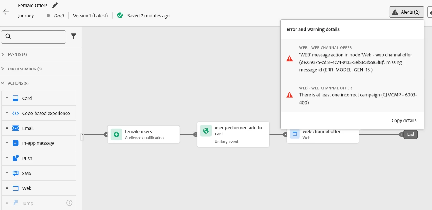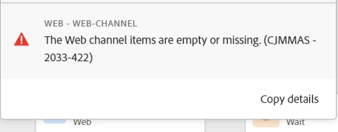 I created a sample journey, attached the screen, for "web channal" action am getting errors, not sure what it means.