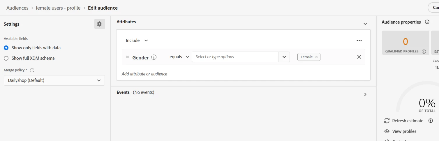 I can see that user related profile details available under "Profiles" under required merge policy, but when i try to create audiences, in profile estimate, that profile is not showing.