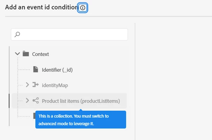 I'm trying to create an abandoned cart journey/email and the Event Condition dialog box does not allow me to expand the productListItems.  The message says I must switch to advanced mode however no Advanced Mode button exists.  Is this a bug or is something wrong with the Schema?