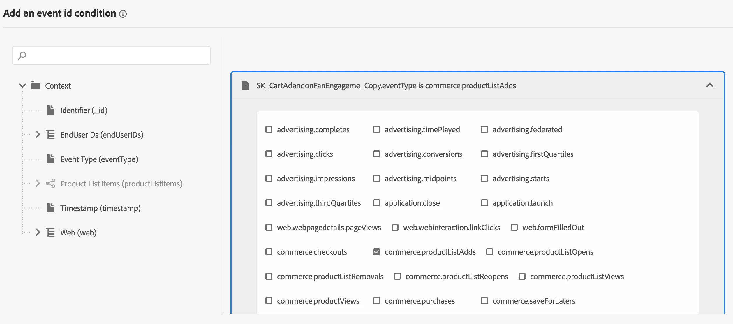 @mktgclouduser When you configure the event select the event type in the field (parameters -> fields) section. Event type allows to select commerce.productListAdds in the event id condition (parameters -> event id condition).