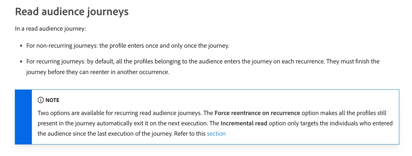 Journey 1 with Allow re-entrance disabled: Starts with a Read Audience scheduled each 1 day.