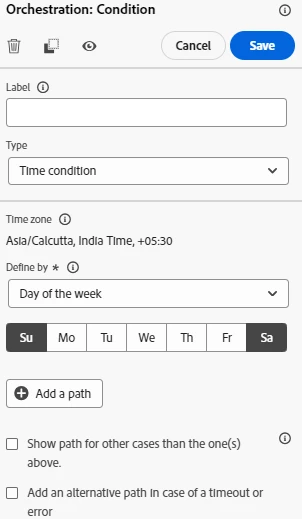 How to write the condition in journeys which checks if today's day of the week is mon-fri or saturday/sunday?