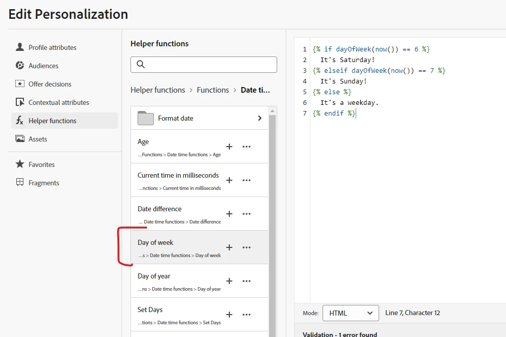 How can I get the day of the week from the expressions section in Adobe Journey Optimizer? I was trying the following way, but I don't see a function that allows me to get if it is Saturday or Sunday based on the now() function.