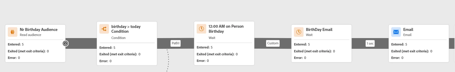 - Use filters to identify profiles whose birthdays fall within a one-day timeframe. This ensures the journey targets the correct audience each day.