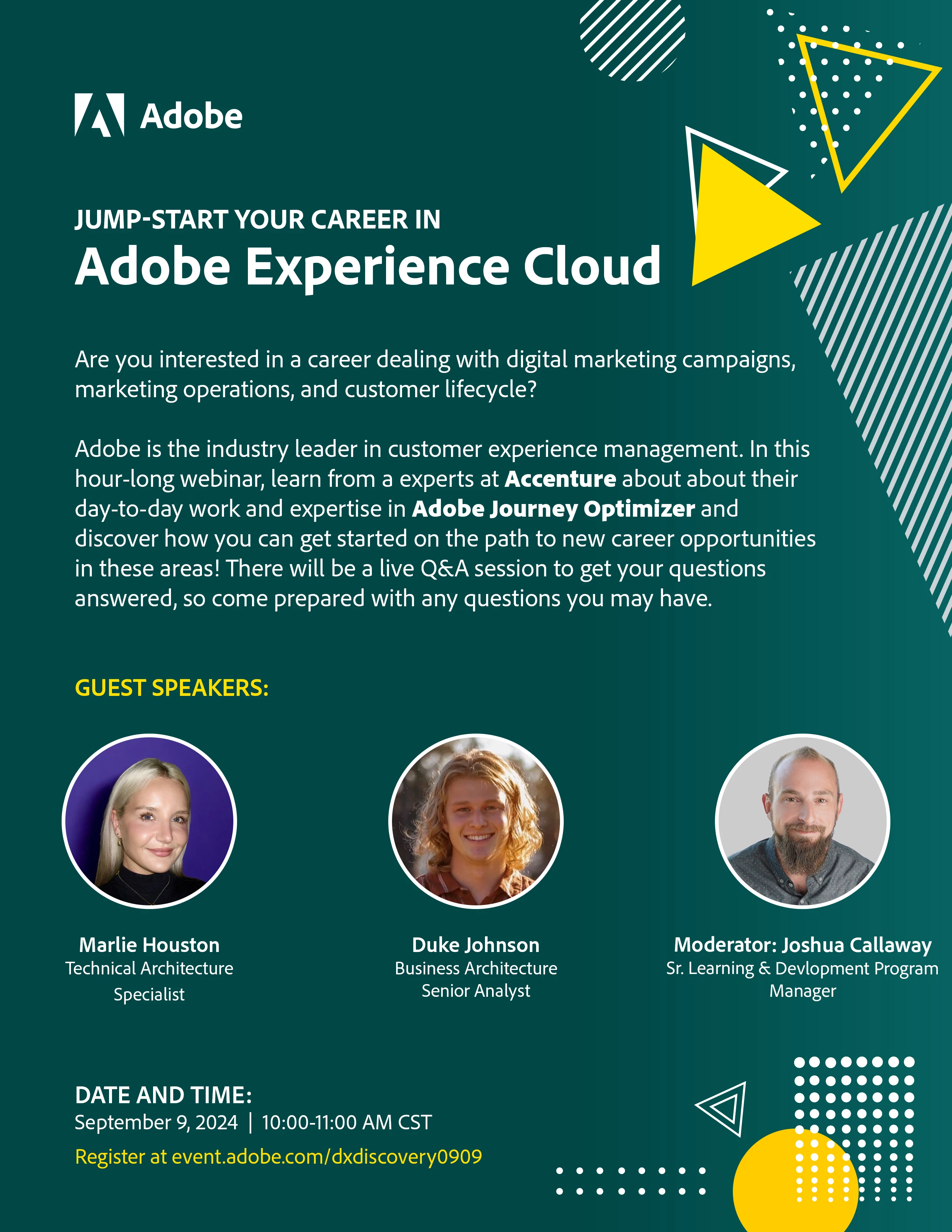 If you're looking to make a shift in your career, or a student trying to discover your future career, this panel-styled webinar is for you! Come learn how to break into Adobe Digital Experience, and see what type of roles are open in this field and ask questions live to Adobe Journey Optimizer experts at Accenture. See below for details:
