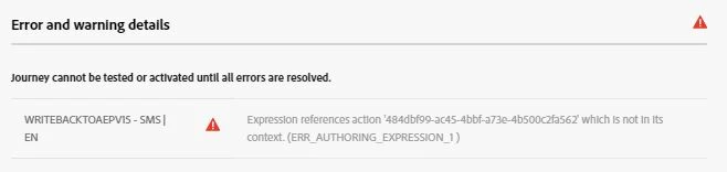 "WriteBackToAEPv15 - SMS | EN": "expression references action '484dbf99-ac45-4bbf-a73e-4b500c2fa562' which is not in its context. (ERR_AUTHORING_EXPRESSION_1 )"