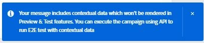 "Your message includes contextual data which won't be rendered in Preview & Test features. You can execute the campaign using API to run E2E test with contextual data".