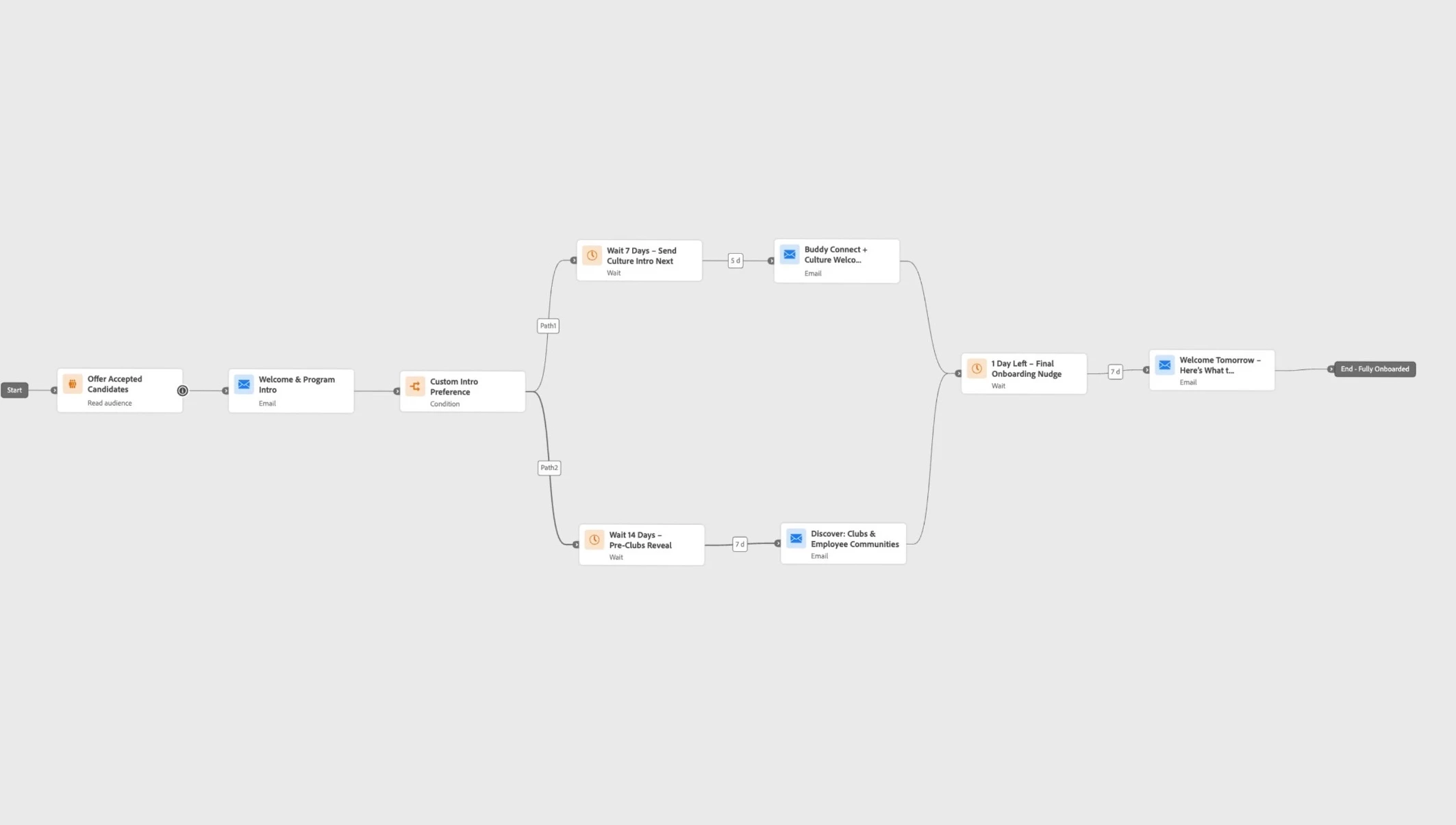 We didn’t try to solve everything at once. The initial journey focused only on accepted candidates and basic reminders. Once stable, we layered in more content, roles, and timing logic.