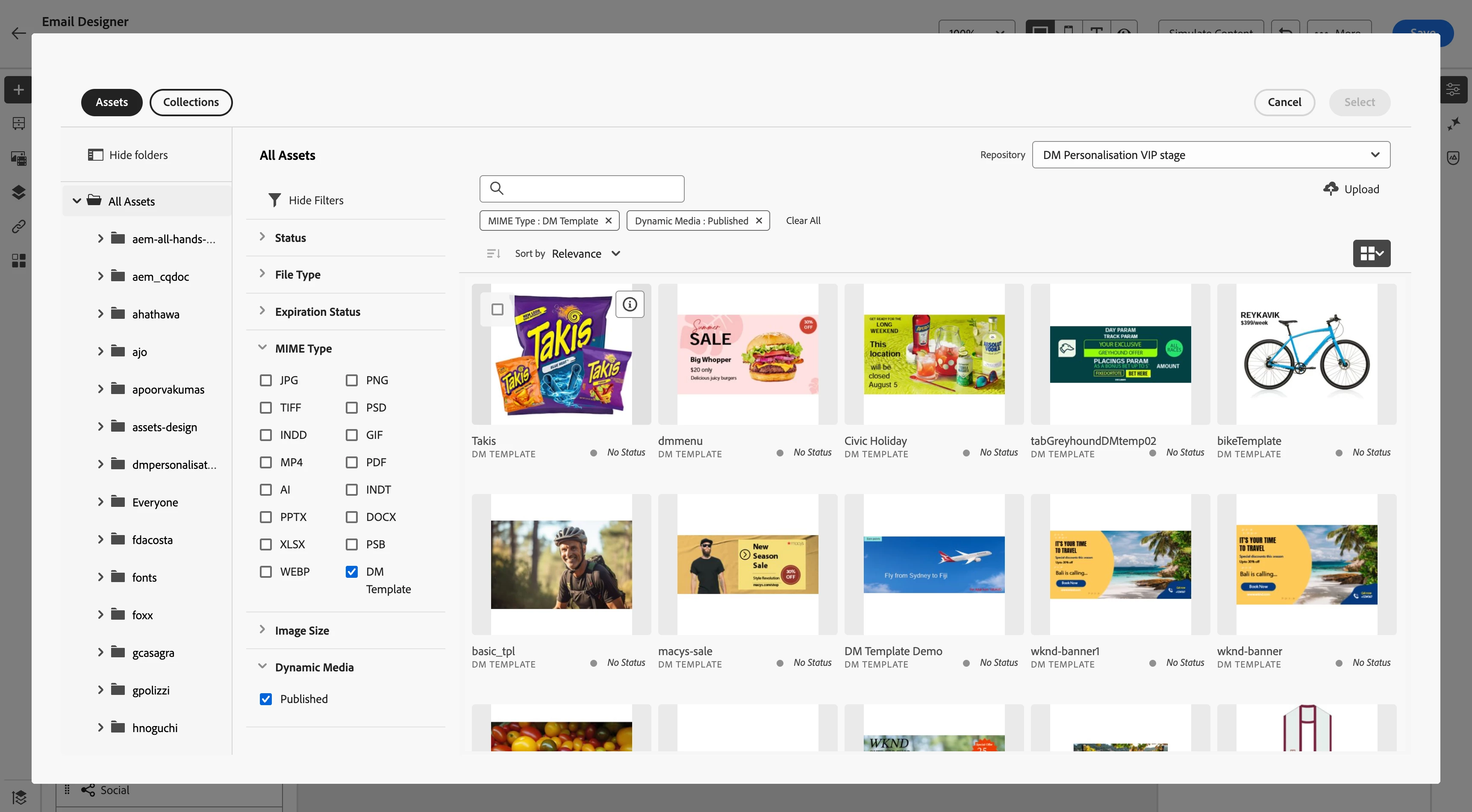- Selection of appropriate Dynamic Media templates in email designer via asset selector