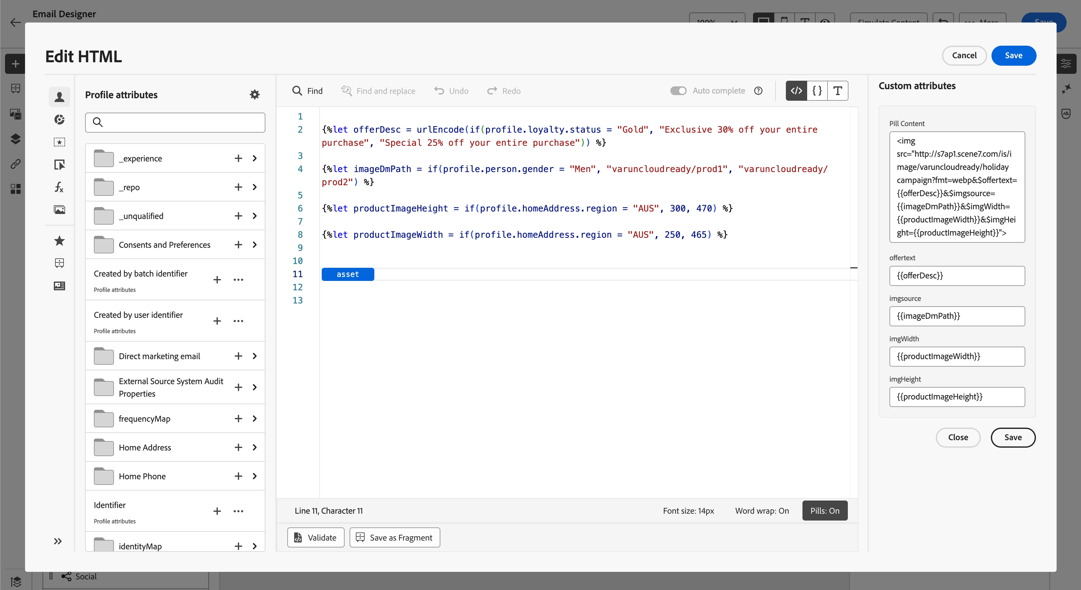 - Apply "DM Template" filter under "MIME Type" section from the filters from left rail of "Asset Selector". Select the Dynamic template from the list and click save.If the "pills" feature is enabled, an asset will be inserted into the code editor as a pill. The user can click on this pill to open the right rail, which displays the asset details and provides options to modify the URL and configure dynamic parameter values for the asset.