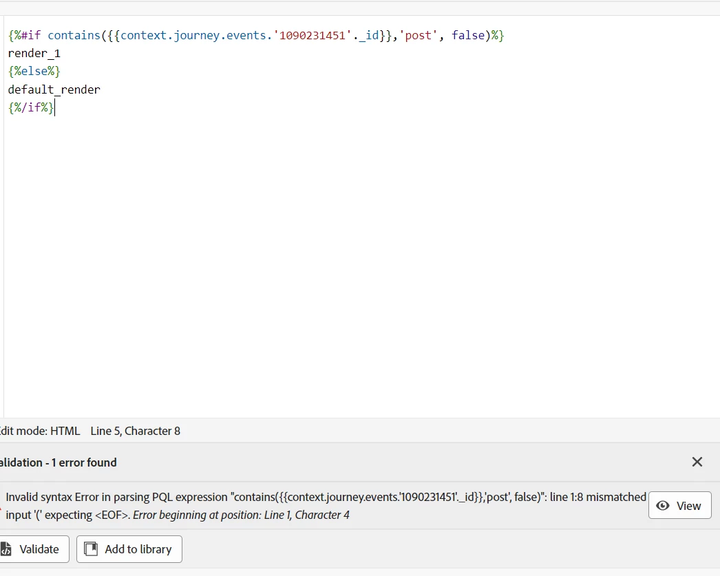 I want to check if the word 'POST' comes back in a contextual attribute: {{context.journey.events.00000._company.igOrder.igEntries.CarrierUid}}