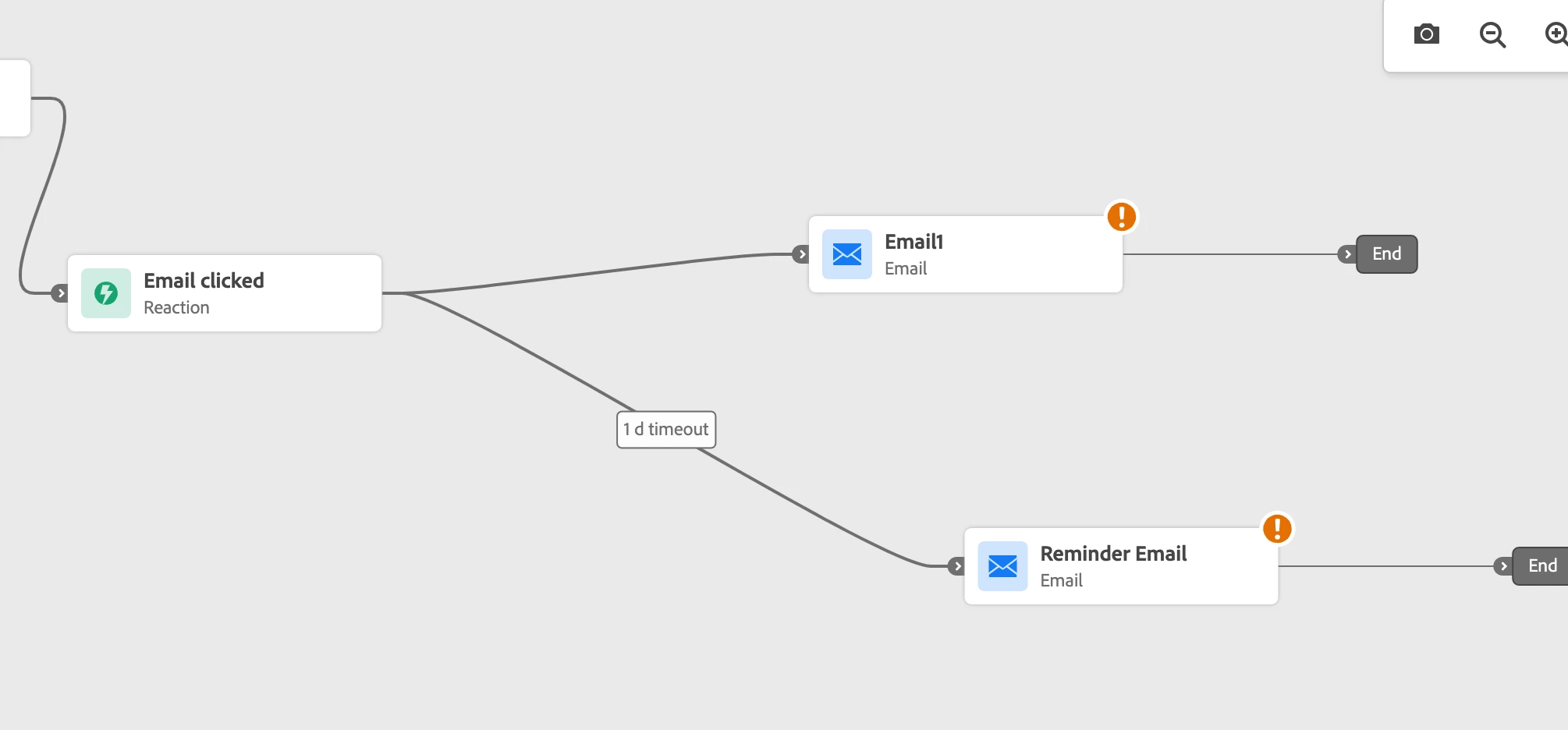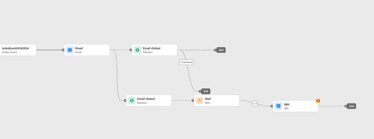 "You can also use this mechanism to perform an action when there is no reaction to your messages. To do this, create a second path parallel to the reaction activity and add a wait activity. If there is no reaction during the period defined in the wait activity, the second path will be chosen. You can choose to send, for example, a follow-up message."