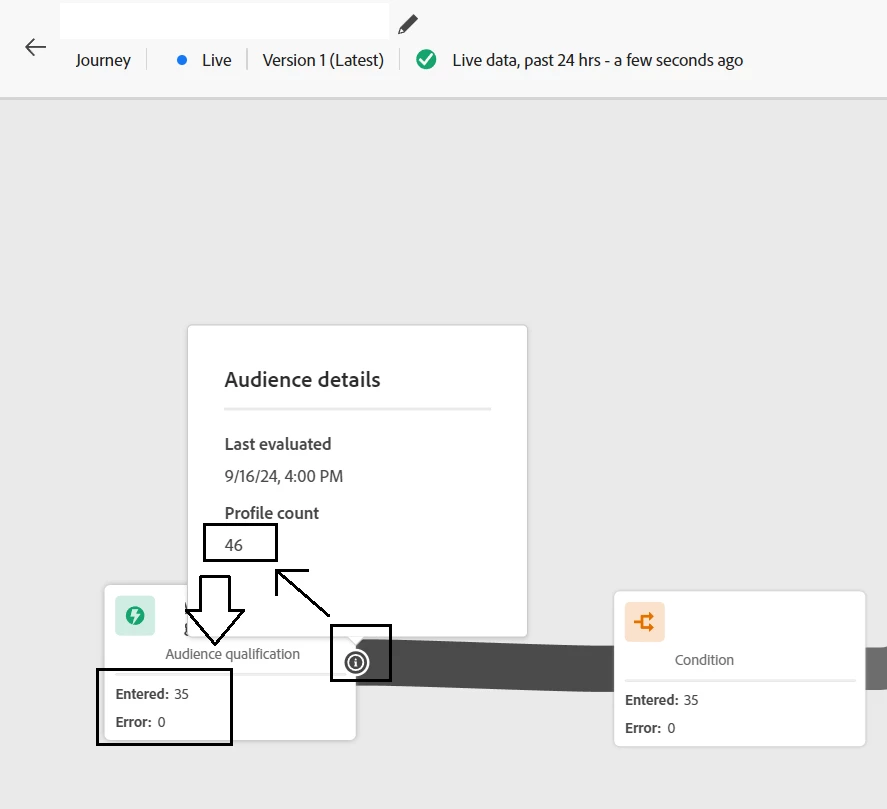 This is related to a live journey for one of our usecase. We are using audience in the journey which is a streaming evaluation method. After the journey runs, we could see the profile count is 46(Same number that i can see it in Total qualified on Profile Over time section) and audience entered in the journey is 35. So, there were 11 profile is missing. How do we check those missing profile? is this data discrepancy or am i looking at it wrong?