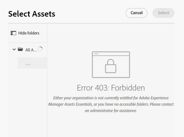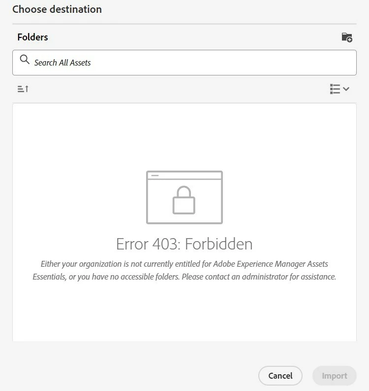 Either your organization is not currently entitled for Adobe Experience Manager Assets Essentials, or you have no accessible folders."