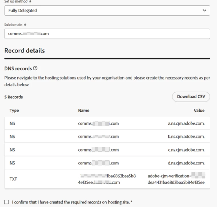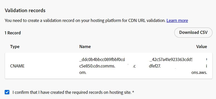- Adobe generates an SSL CDN URL validation record. Partner shares the record with the client. The client’s IT team configures this validation record into their hosting platform. Once the client confirms record configuration, the Partner checks the box "I confirm that I have created the required records on the hosting site" in the subdomain configuration in AJO and then clicks Submit.