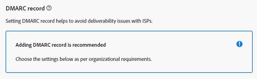 Set up the DMARC record. If the subdomain already has an existing DMARC record, it will be fetched by Journey Optimizer as shown below. You can use the same values or change them as gathered from the client in the DMARC configuration.