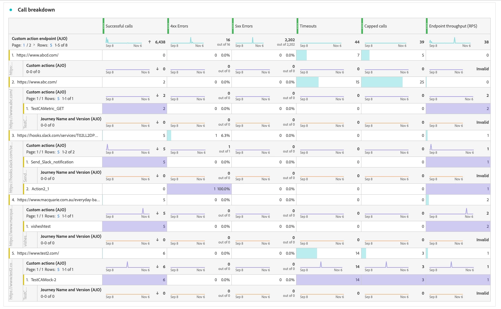 This dashboard provides a granular view of custom action performance across multiple dimensions. Organized in a tabular format, it categorizes rows by endpoint type—such as custom action endpoints, individual custom actions, and journey-level identifiers—allowing users to drill into specific execution contexts.