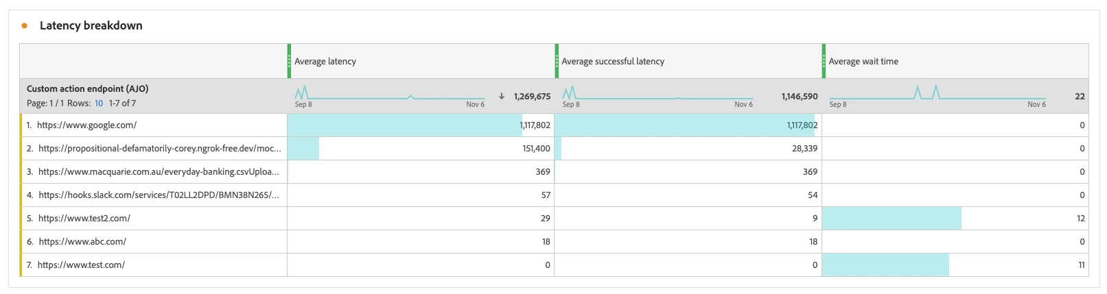 💡 Visual bar indicators within each cell provide quick, comparative insights across endpoints. This breakdown helps users pinpoint high-latency endpoints, optimize response times, and maintain smooth journey execution.