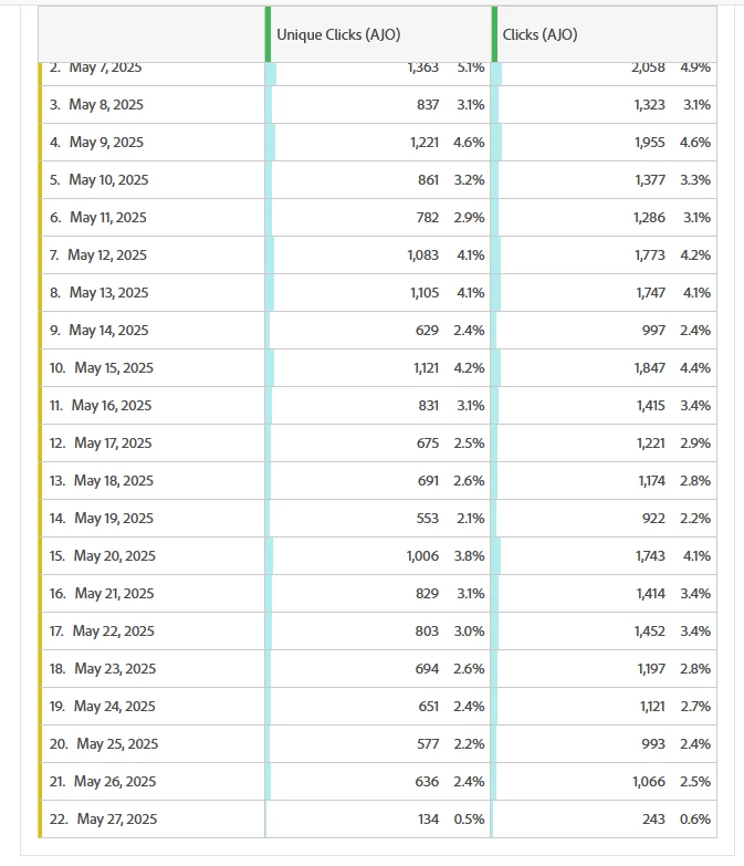 Hi Team, For a journey consisting multiple emails we are observing that on a particular day we are seeing a significant bump in number of clicks in email, but followed by no clicks for next 4-5 days. The profiles enter journey on a daily basis so it should not be happening, we should be observing certain number of clicks everyday. Can you please guide on what could be the reason. Thanks