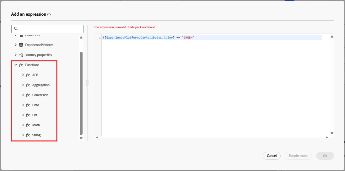 For example, I want to get all the users whose "Color" field is "GREEN" - #{ExperiencePlatform.CarAttributes.Color} == "GREEN" - and limit it to 10 profiles. All coded in advanced mode.