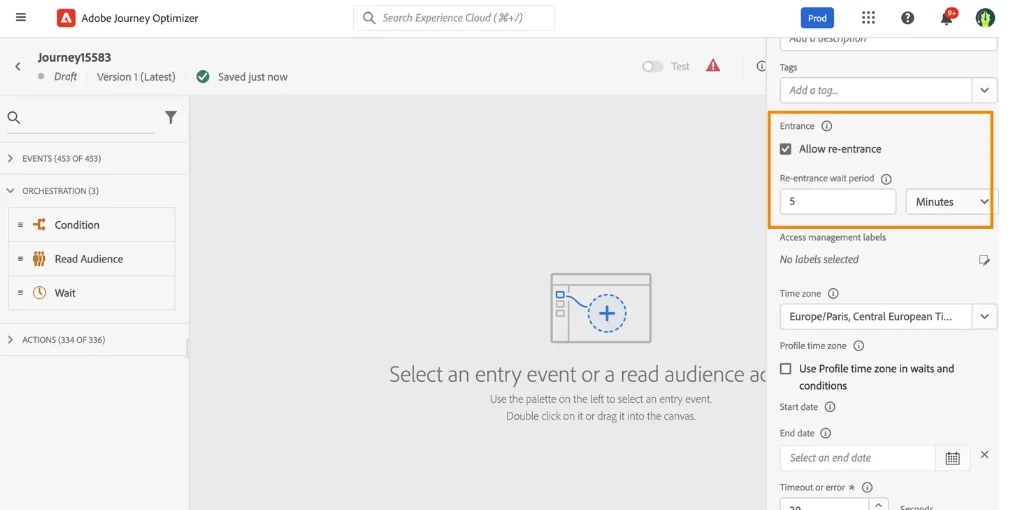 The counter applies only to the selected journey version. The counter resets to zero when the journey is duplicated or when a new version is created. After a reset, the entering profiles take the nominal path again until the counter limit is reached.