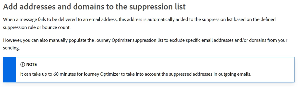 I have a question about the suppression list feature in AJO. As far as I comprehend, this feature allows us to add users whom we do not wish to contact. I included my personal email address in this list and scheduled a campaign to send me an email. However, I am still receiving emails from AJO, and I am uncertain whether this functionality is functioning correctly.