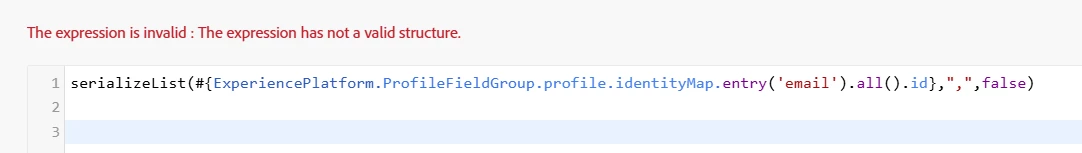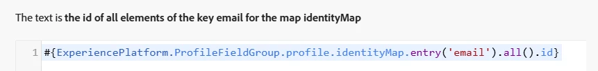 serializeList(#{ExperiencePlatform.ProfileFieldGroup.profile.identityMap.entry('email').id}, ",", false)