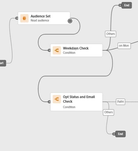 My Journey Starts with a read audience and I have added the Day of week check [ Tues|Wed|Thurs|Friday] . Now the question is Concern about the weekday checks- right now when the check returns weekend/monday, it looks like it ends the customer journey.