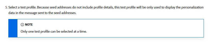 Test profile will be only used to display the personalization data in the message sent to the seed addresses.