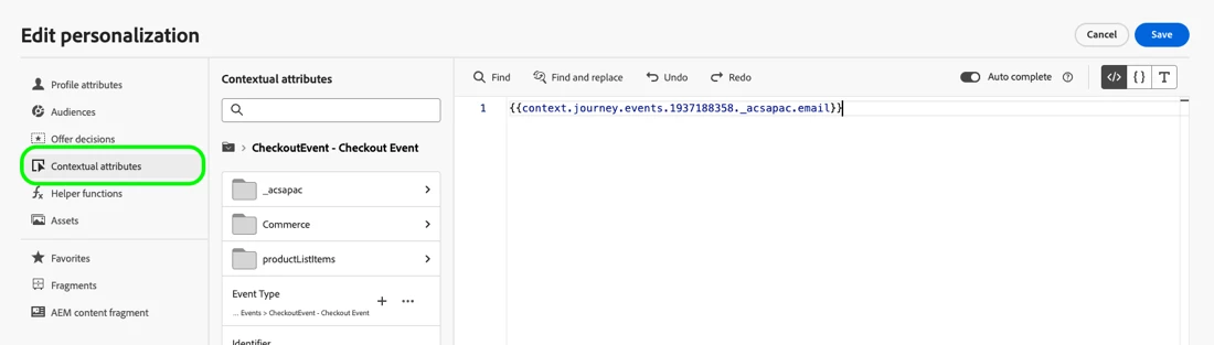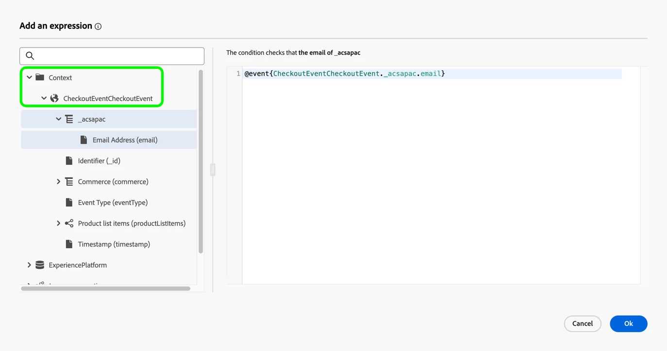 - In this window you’ll need to define the Email Address to use. In the left navigation, find your events Email Address field. As the Email Address is coming from the event, you should find it under Context. In this use case, we're trying to solve for if the profile may not exist yet, so it's important to ensure you haven’t selected the Email Address located on the Profile.
