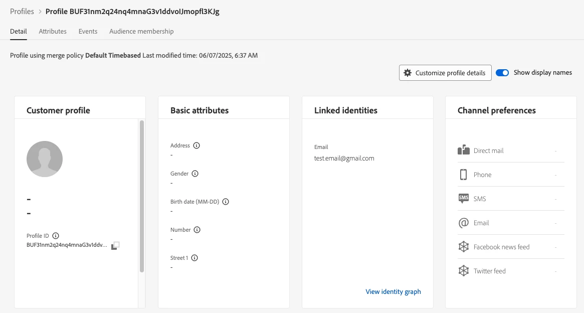 Later, the profile can be properly created from the CRM data. Assuming it includes the same Identity as the Event, this data will stitch to the shell profile, creating a complete picture of the Profile. This will include the new Profile Attributes from the CRM, and also pull in the Event and Delivery Logs.