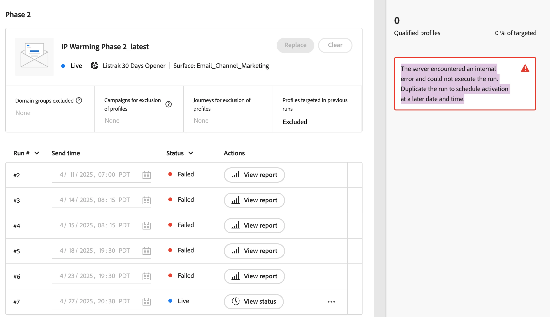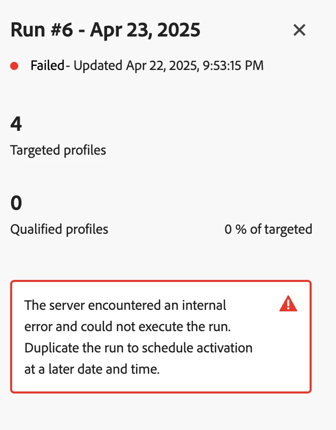 "The server encountered an internal error and could not execute the run. Duplicate the run to schedule activation at a later date and time."