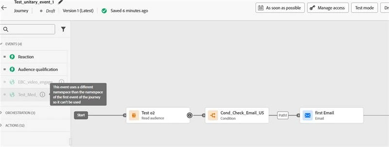 Unable to use unitary event with a different namespace other than the namespace of read audience in my journey