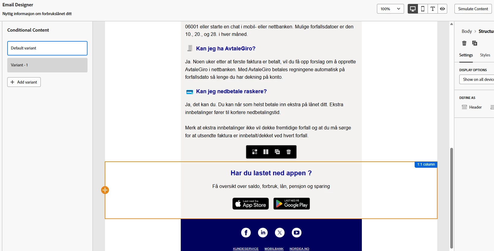 The conditional content feature is a strong and must wanted feature in the email designer. But it has some limitations when it comes to usability. We would like to be able to see the actual conditional code somewhere - like a button when you have the open the inline menu with the conditional content choice. The only way to see and access that code "wrapped" around a email module is to close the template, go back, open it - and in the preview before editing you can actual see the code. This code should have been possible to se, even edit in an advanced mode like with expressions, in a own window when working with the content inside an open template.