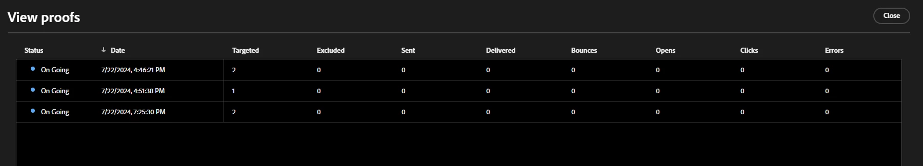After sending the proof and verifying its contents, the "View Proof" section consistently displays zeros for Delivered, Excluded, Sent, Bounce, Open, Clicks, and errors, despite receiving the proof email. Can someone please clarify why this discrepancy occurs?