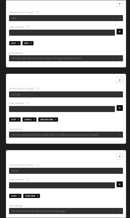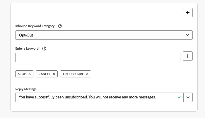 - When I reply with an opt-in or opt-out keyword (e.g., 'STOP', 'START'), the action does process correctly in the backend (I see the user's subscription status update in Adobe Campaign).