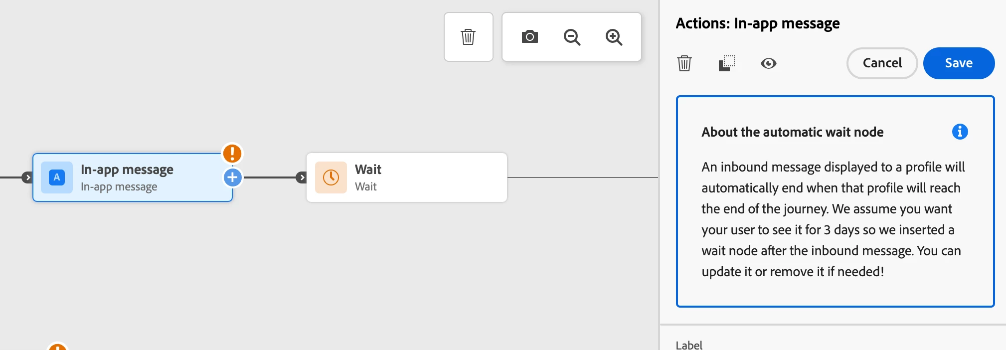 Each inbound message activity (In-app message, Code-based experience, or Card) comes with a 3-days Wait activity. As inbound messages automatically end when a profile reach out the end of the journey, we assume that you want your users to see it at least for 3 days. You can remove this Wait activity, or change its configuration if needed.