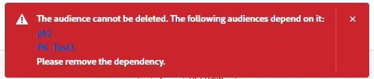 Does the system recognize that an audience is a component of an another audience before you delete it? For example, if I have an activated audience (Audience X) that's made up of Attribute 2, Audience B, and Event 1, and I go to delete Audience B, will the system give a warning? What happens if I do delete Audience B?