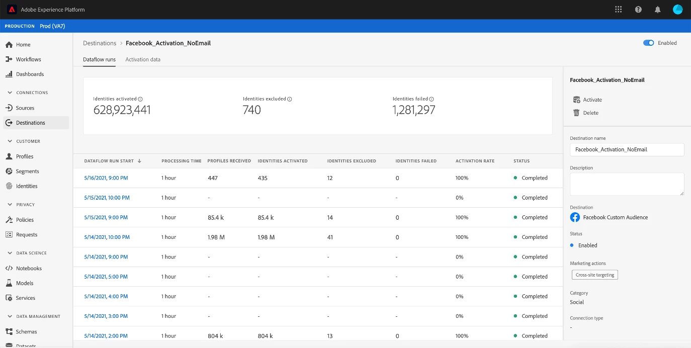 Once you have decided which destination fits your use-case and you have shared a segment to a destination, you can monitor the dataflows to see exactly how many profiles were received, how many identities were sent, and if there were excluded identities as well.