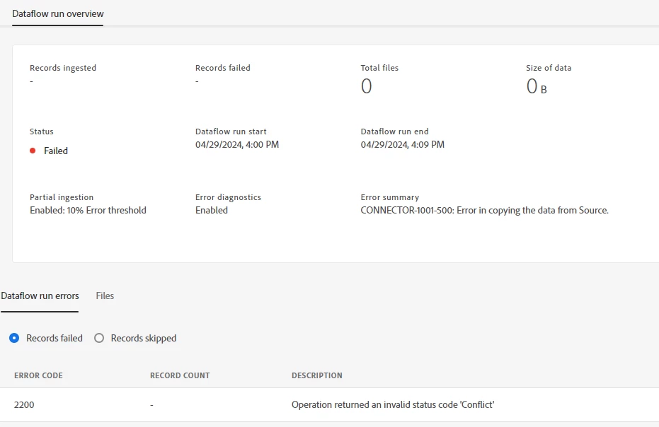 CONNECTOR-1001-500: Error in copying the data from Source.