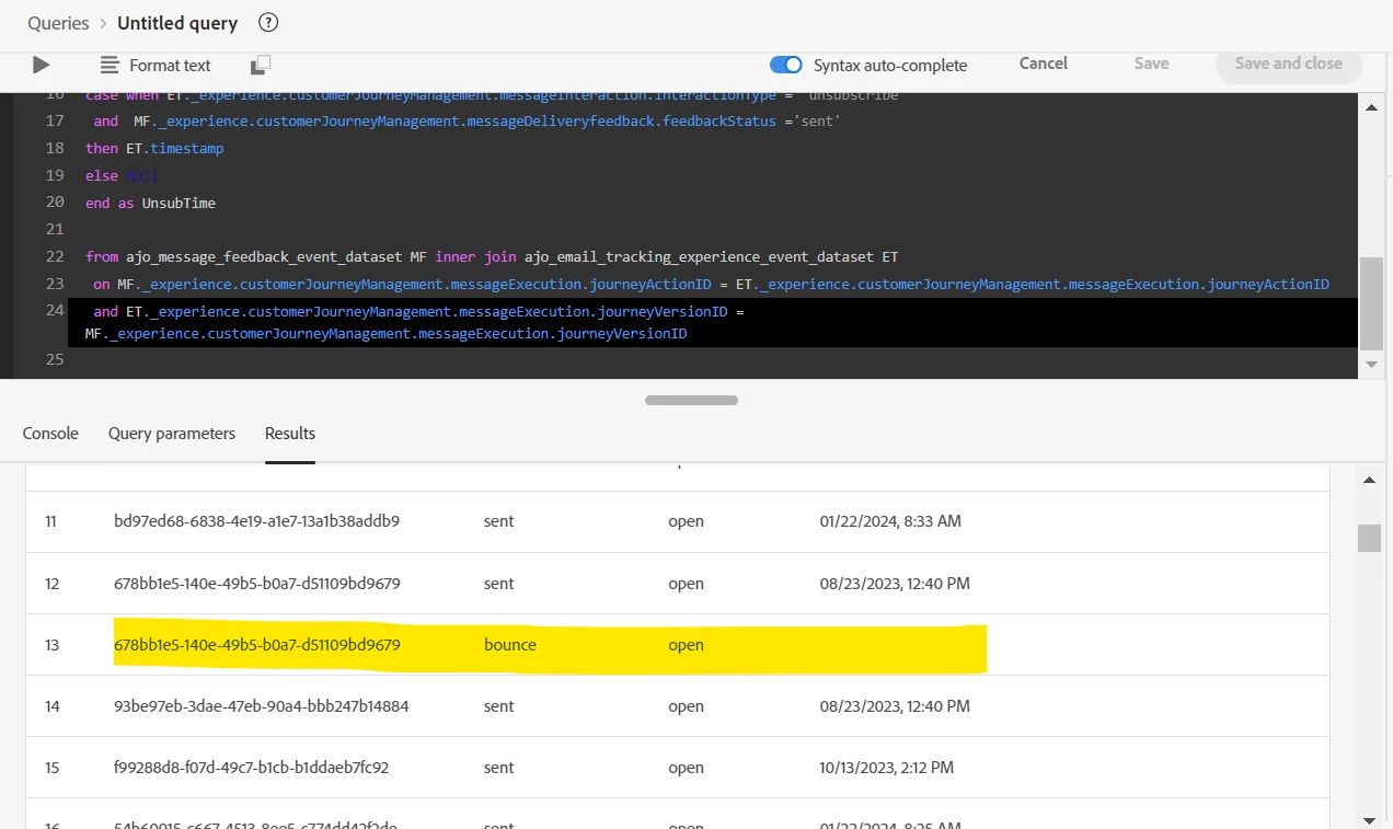 Observing Illogical results when message feedback and email tracking datasets (AJO OOTB) are joined using query service