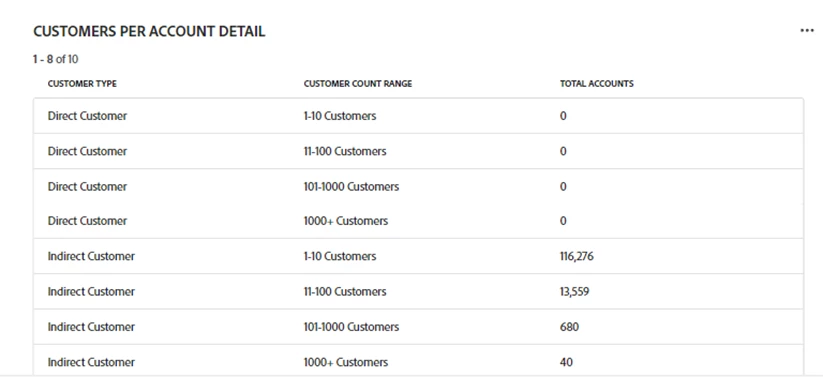 Customer Per Account Detail: This widget categorizes accounts based on customer type, which defines how an individual person profile is associated with an account profile. The classified either as Direct Customers, who are directly associated with an account through a person component, or and Indirect Customers, who are linked through an account-person relation table. It shows the number of accounts within different customer count ranges. It provides quick insights into account distribution, helping identify growth opportunities and optimize customer engagement strategies.