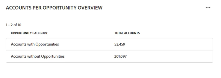 Accounts per Opportunity Overview: This widget shows the number of accounts with and without associated opportunities. It helps quickly identify potential areas for growth by highlighting accounts that might need more attention or nurturing to unlock new opportunities.