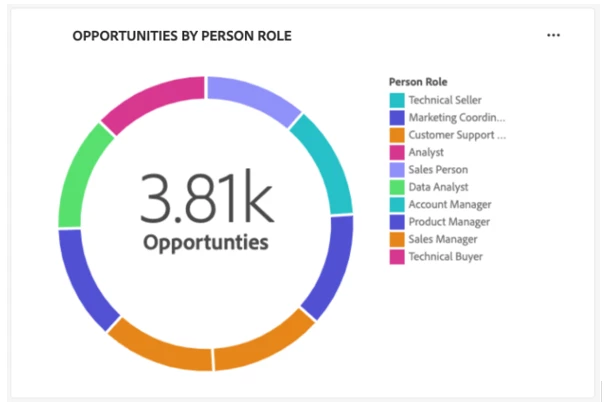 Opportunities by person role: This widget helps businesses understand which roles within organizations are driving the most opportunities. By identifying key decision-makers or influencers, companies can tailor their outreach and communication strategies to target these roles more effectively, maximizing conversion rates and improving relationship management.