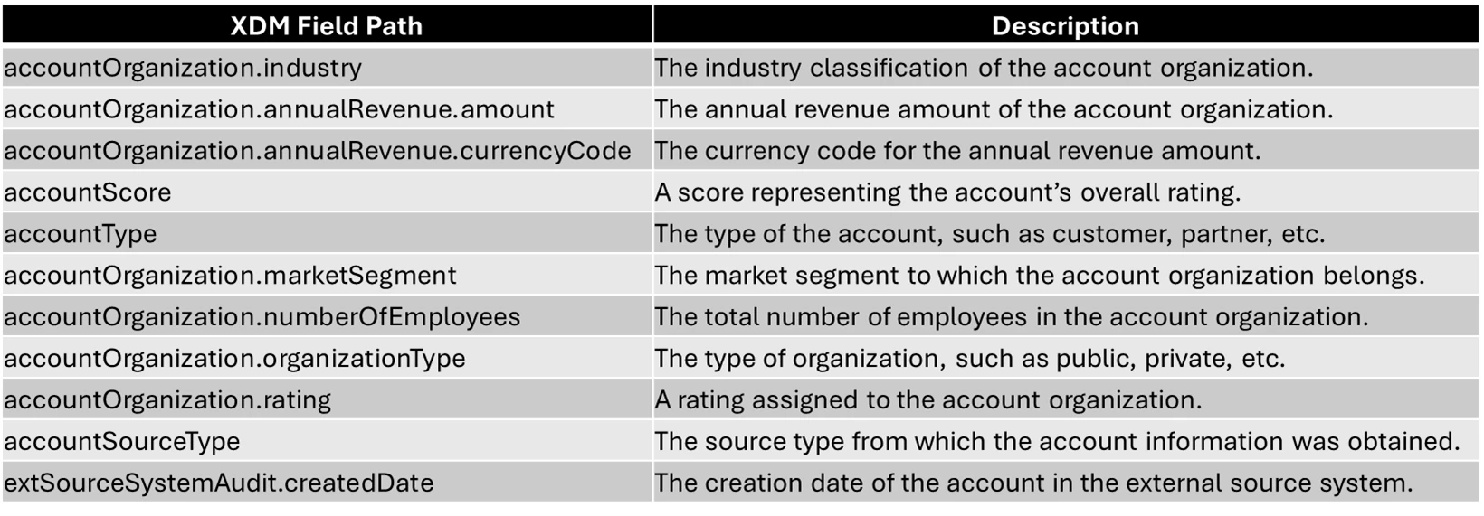 - Leverage Out-of-the-Box (OOTB) Schema: Maximize the functionality of B2B features like Insight Dashboards and Account Segmentation by utilizing the OOTB schema within Adobe Experience Platform (AEP).