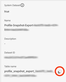 You can then go to the dataset page where you'll find the exact table name which you can then copy to use in Query Service: Ie: profile_snapshot_export_fea1xxf3_0edb_xx74_b964_8a63d48xxxxx